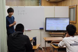意外な効果をもたらすのが「電子添削」です。課題作文や感想文、英作文はもとより、個々のノートをスキャンし、電子黒板上での添削指導をします。具体的に問題点をビジュアル的に指摘することで、ポイントの理解と共有が可能となります。